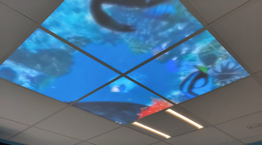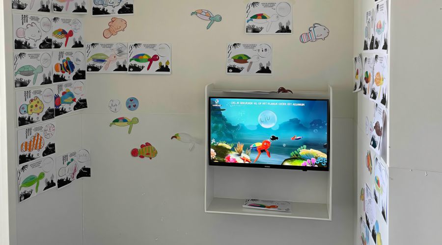 Denk aan een digitaal aquarium waarin kinderen hun eigen vis inkleuren en die daarna echt zien rondzwemmen op het scherm. Dat geeft controle en plezier op een spannend moment en verkort de beleving van wachttijd. Daarnaast zijn er rustgevende wand en raam visuals en andere interactieve elementen die sfeer brengen zonder de zorg te hinderen.