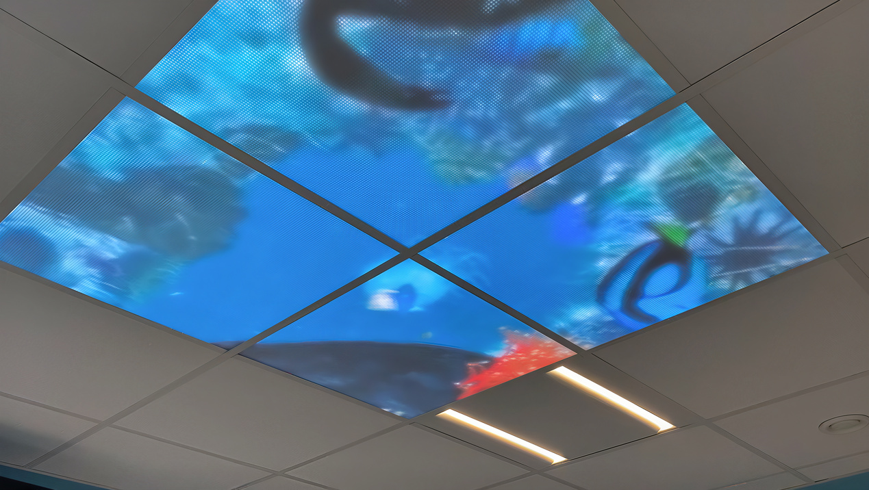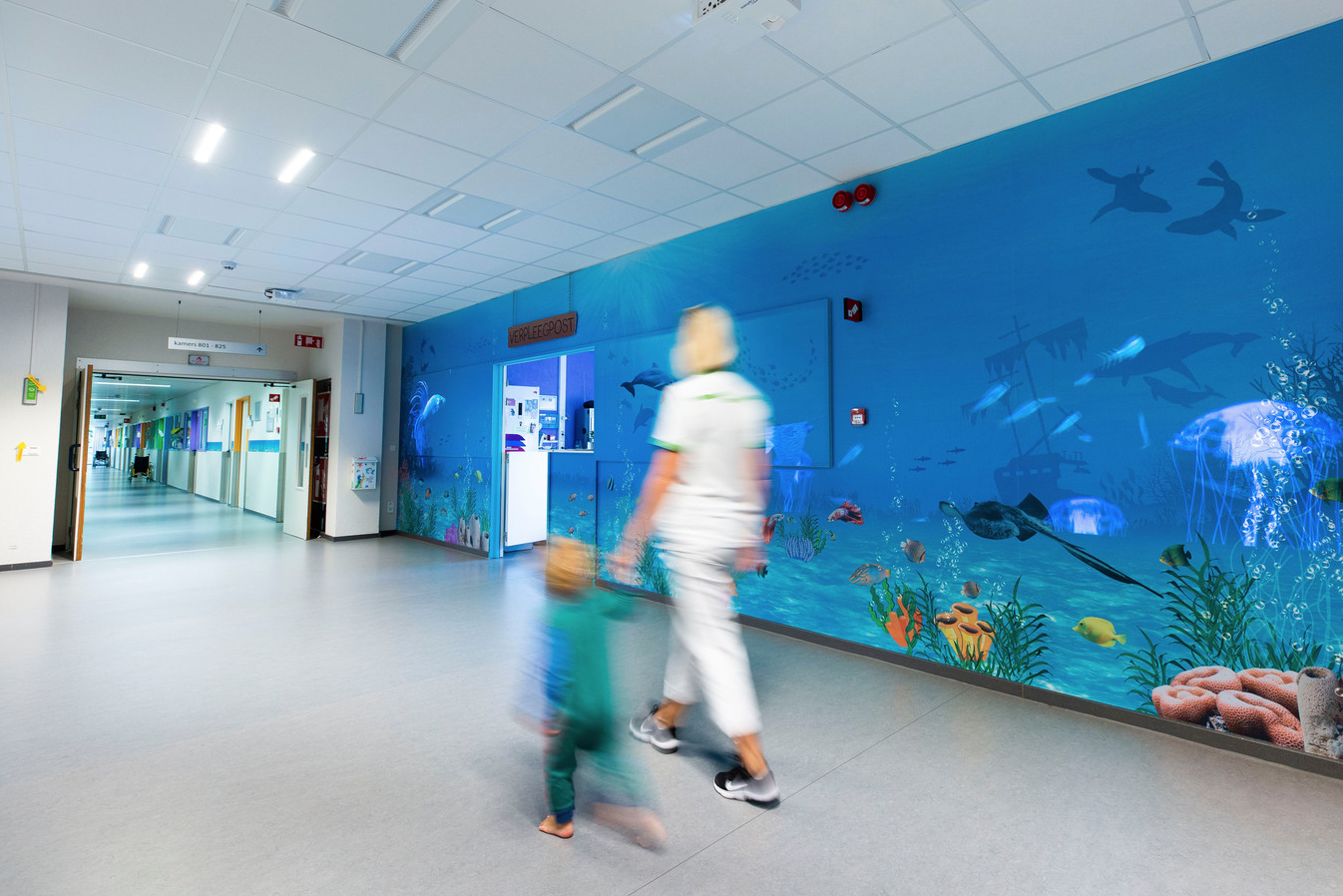 Denk aan een digitaal aquarium waarin kinderen hun eigen vis inkleuren en die daarna echt zien rondzwemmen op het scherm. Dat geeft controle en plezier op een spannend moment en verkort de beleving van wachttijd. Daarnaast zijn er rustgevende wand en raam visuals en andere interactieve elementen die sfeer brengen zonder de zorg te hinderen.