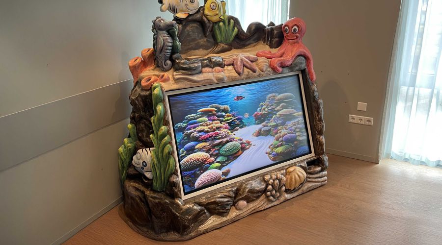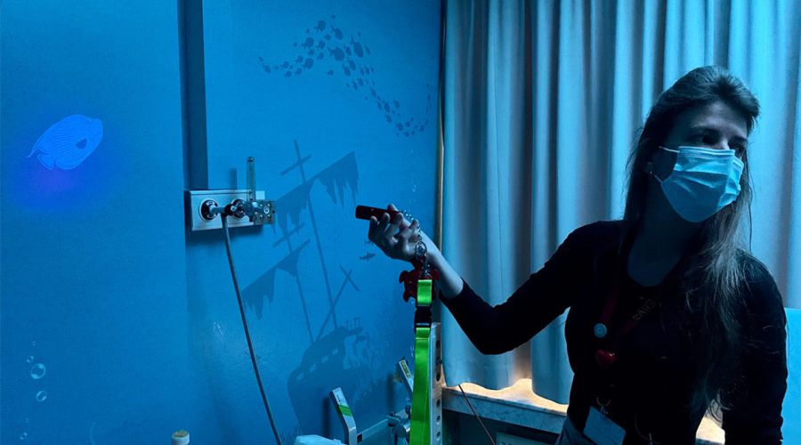 Denk aan een digitaal aquarium waarin kinderen hun eigen vis inkleuren en die daarna echt zien rondzwemmen op het scherm. Dat geeft controle en plezier op een spannend moment en verkort de beleving van wachttijd. Daarnaast zijn er rustgevende wand en raam visuals en andere interactieve elementen die sfeer brengen zonder de zorg te hinderen.