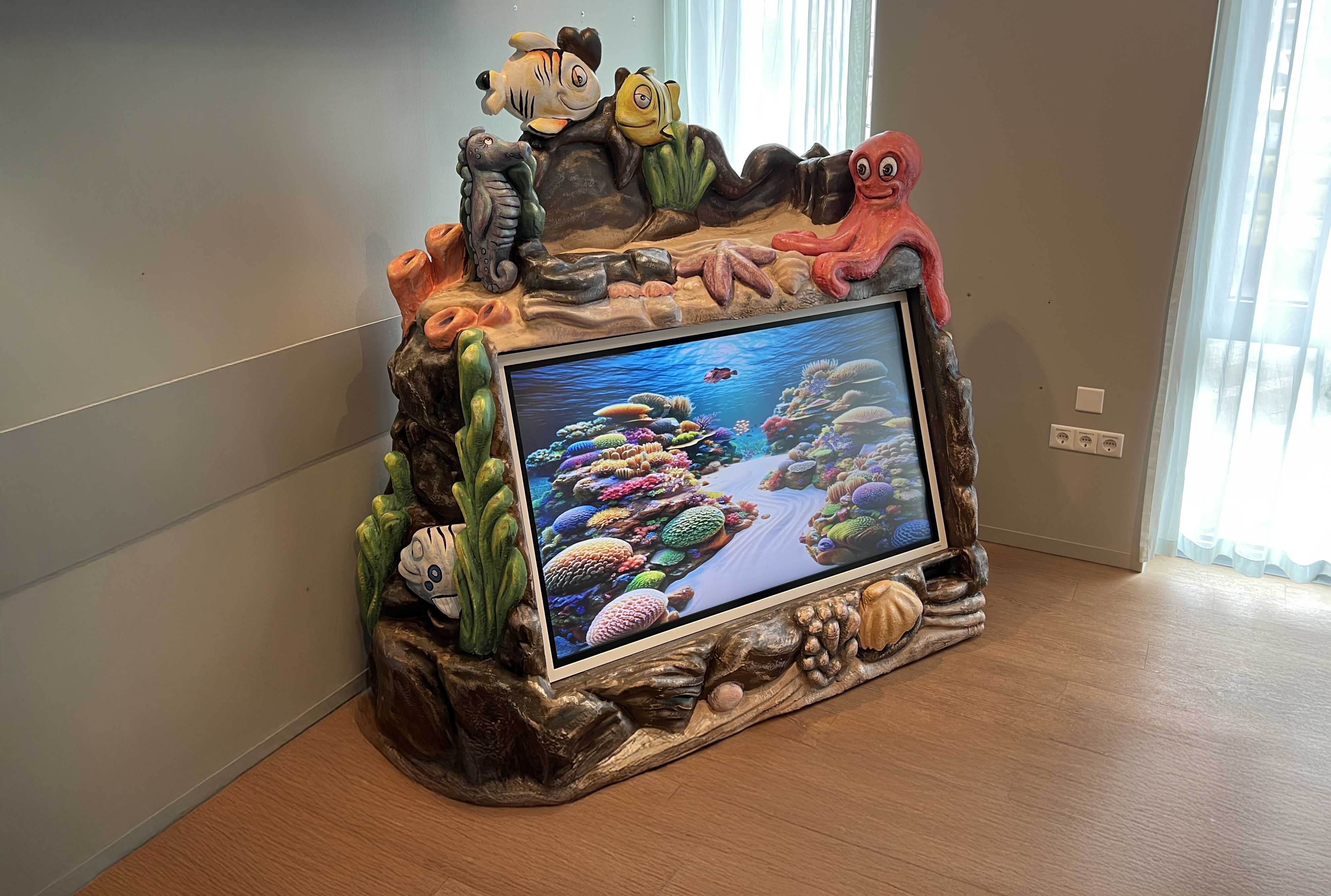 Denk aan een digitaal aquarium waarin kinderen hun eigen vis inkleuren en die daarna echt zien rondzwemmen op het scherm. Dat geeft controle en plezier op een spannend moment en verkort de beleving van wachttijd. Daarnaast zijn er rustgevende wand en raam visuals en andere interactieve elementen die sfeer brengen zonder de zorg te hinderen.